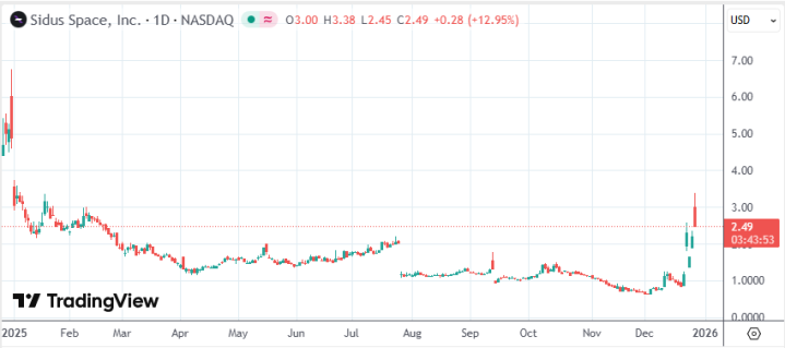 截至发稿,SidusSpace日内涨幅收窄至13%报2.49美元,本周累计上涨约115%。