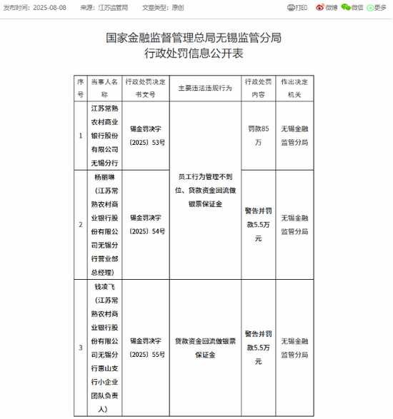 日前,国家金融监督管理总局无锡监管分局一则85万元罚单,将常熟银行无锡分行推至聚光灯下。这张涉员工行为管理不到位、贷款资金回流违规的罚单,不仅让该行年内再添监管记录,更揭开其合规管理的持续漏洞。
