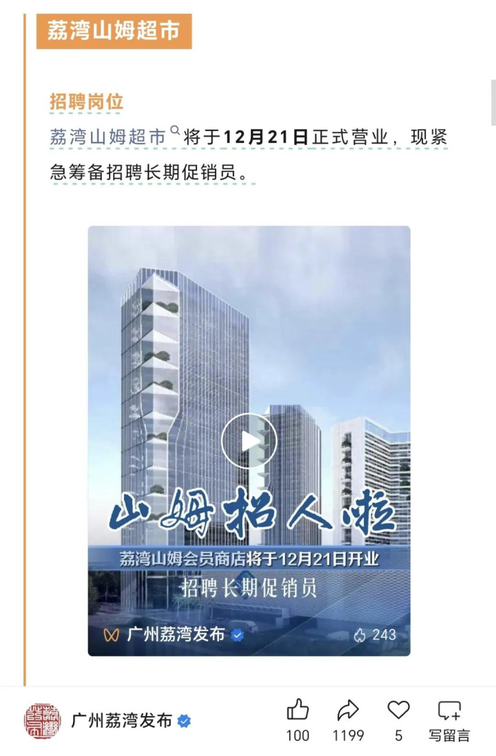根据广州荔湾发布消息,荔湾山姆会员商店已经进入招聘阶段,将于今年12月21日正式开业。