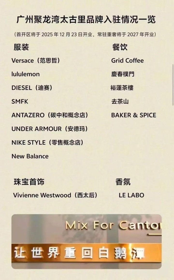 一线奢装Versace(范思哲)、英国品牌西太后、SMFK广州首店、ANTAZERO安踏碳中和概念店、精品咖啡Grid Coffee、上海裕莲茶楼等广州典丰,可谓星光熠熠。